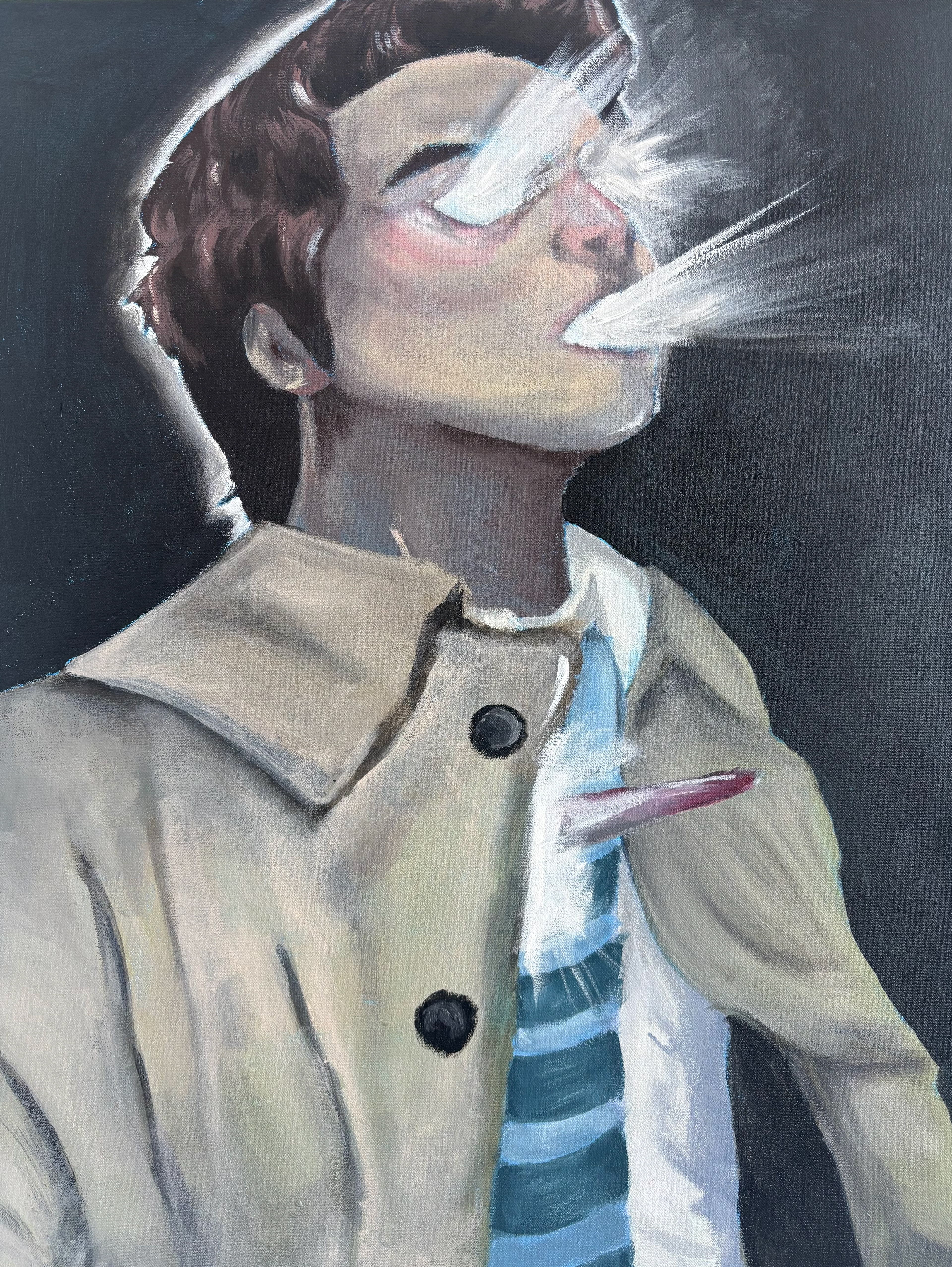 This work was the first painting I did coming back from summer break for my advanced painting class, and it is a screencap from Supernatural. I forgot a lot of basic painting techniques because I didn't paint much over the summer.
