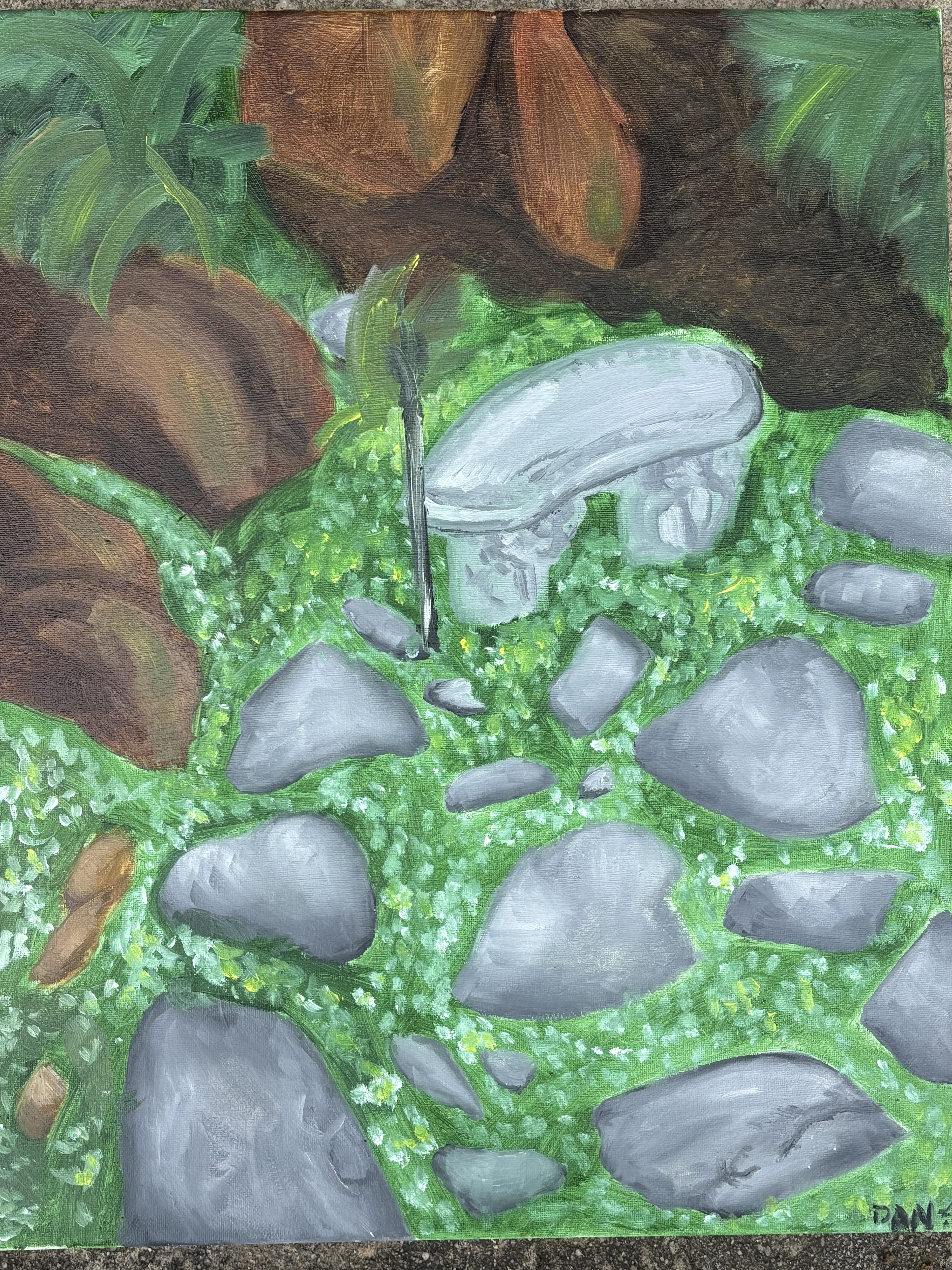 This piece is a painting I had to do for a landscaping class, and it is of the little area next to a pond. I am quite fond of the way it is messy and splotchy.
